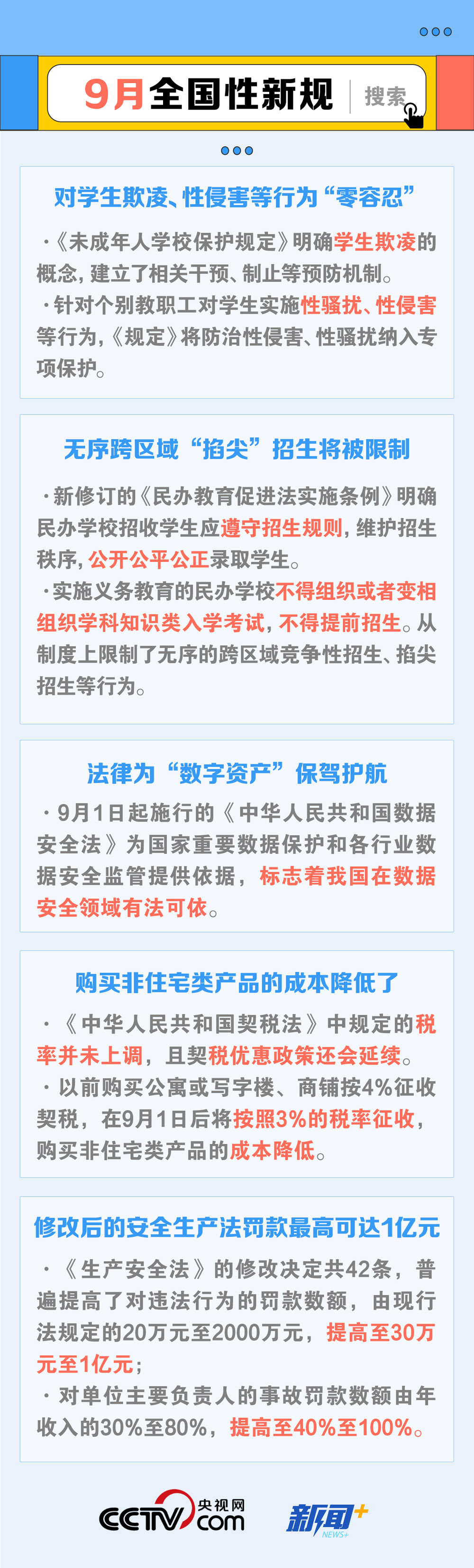 央视网消息(记者 徐也晴):更全面、更安全、更严格、更优惠……从数字安全、生产安全到教育、购房,九月起,一批新规将正式实施,影响人们的生活。